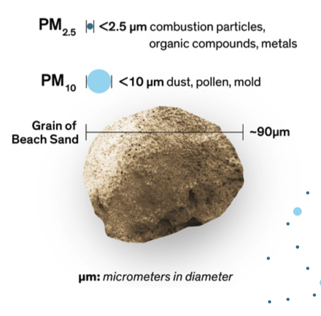 Polusi udara yang masuk ke dalam indikator indeks kualitas udara (AQI) adalah Partikulat Mikron PM2.5 dan PM10. PM2.5 atau polutan udara yang berukuran 2,5 mikron ini menjadi sangat berbahaya bagi tubuh karena ia memiliki ukuran yang sangat kecil sehingga mengakibatkan mudah terhirup dan sulit untuk disaring (bahkan ketika kita memakai masker). Diameter partikel ini lebih kecil daripada rambut manusia, bahkan lebih kecil dari sel darah merah.
