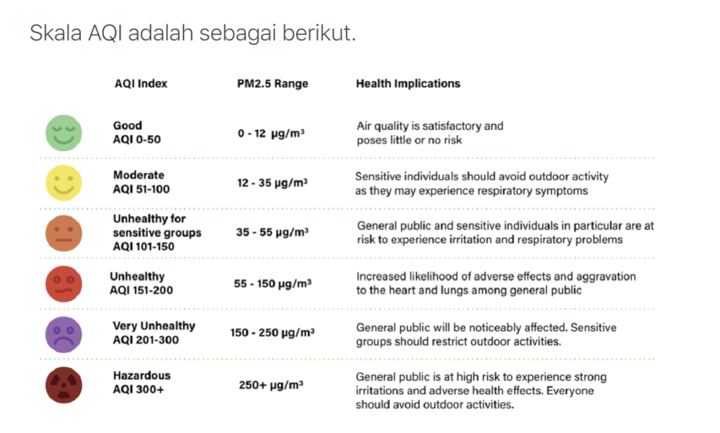 Wah banyak sekali ya dampak buruk dari polusi udara bagi kesehatan kita. Oleh karena itu, penting bagi kita untuk mengetahui cara mengurangi paparan polusi udara. Pertama, kita harus mengenal Indeks Kualitas Udara (AQI). AQI adalah sebuah indeks yang menunjukkan indikasi polusi udara di suatu lokasi tertentu. AQI adalah metode pengukuran global yang dimulai dari titik 0 di ujung paling bawah dan dapat melebihi 300 di ujung paling atas. Semakin tinggi nilai AQI, semakin tinggi tingkat polusi udara dan semakin tinggi risiko udara terhadap kesehatan kita (Nafas, 2024).